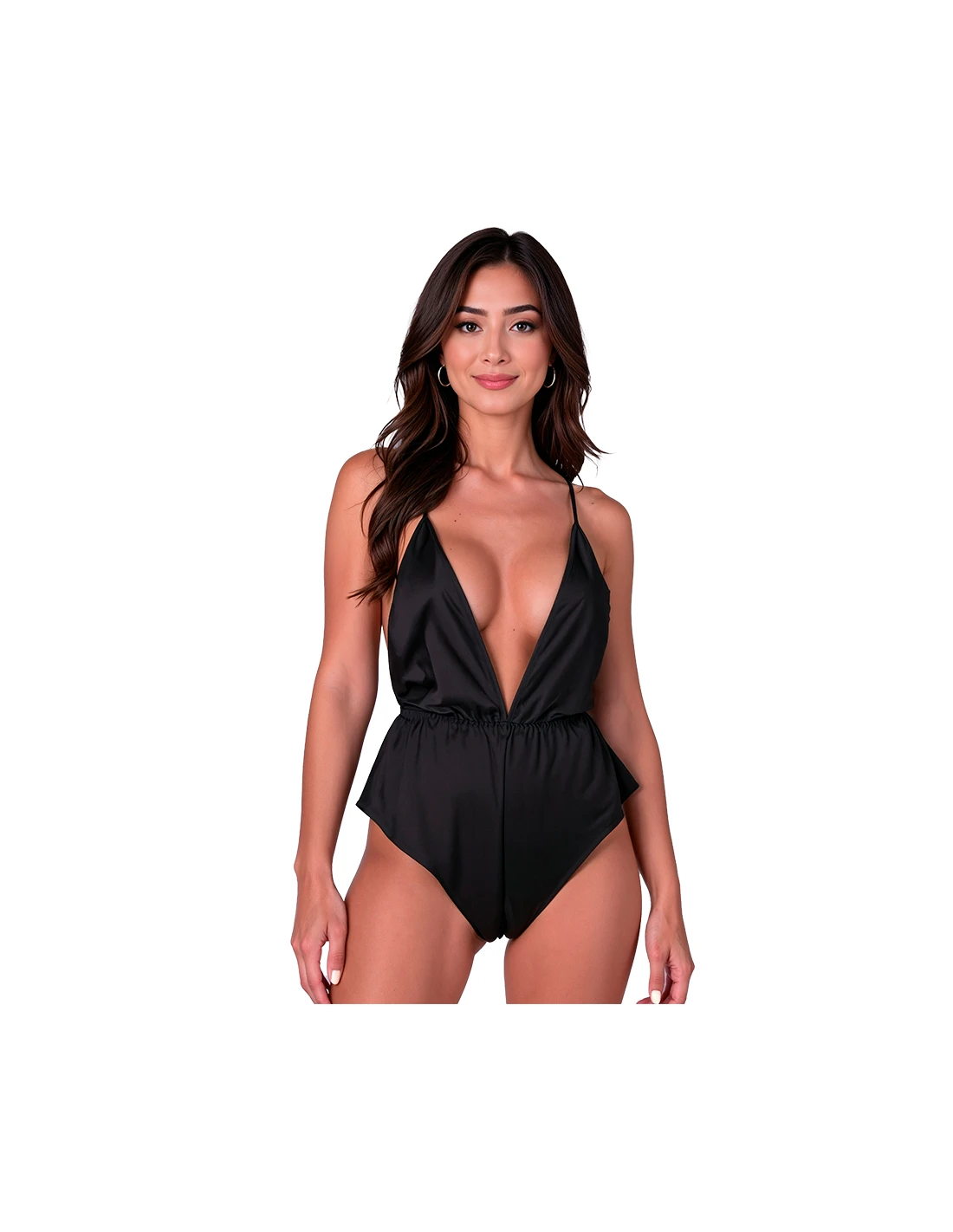 - Estilo: Body satinado con escote en V pronunciado y tirantes cruzados ajustables en la espalda