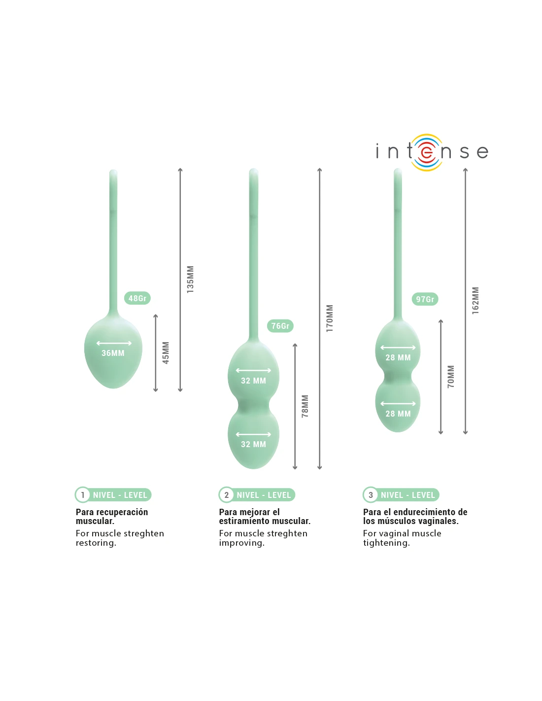 - Pack completo de 3 bolas Kegel: cada una con un peso y tamaño diferente para avanzar progresivamente.