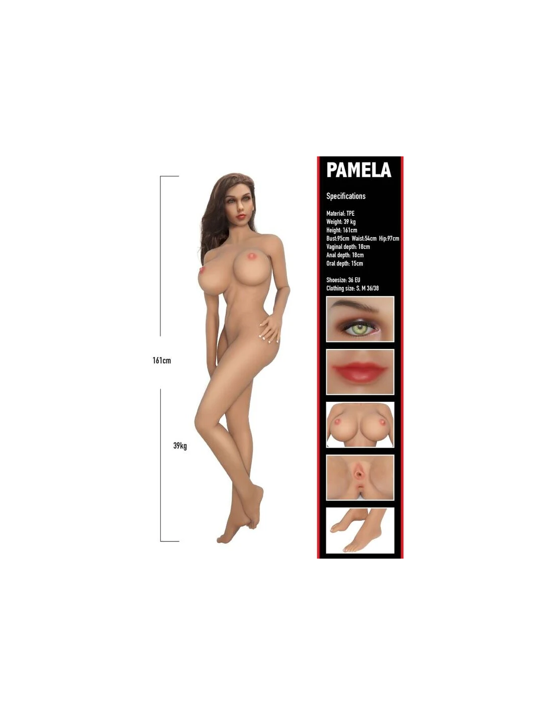 Pamela es una gran muñeca de amor de tamaño real hecha de materiales de primera calidad como TPE suave. El diseño presenta un esqueleto de acero resistente para una máxima durabilidad y uso independiente, y flexibilidad para colocar la muñeca en la posición que elija. Cada dama de Bangers Babes presenta canales realistas con textura oral, vaginal y anal que se pueden calentar si se desea. Otros detalles realistas incluyen postizos de calidad, uñas falsas y rasgos faciales delicados. Cumpliendo con un estándar de calidad excepcional, esta encantadora dama será su juguete favorito durante muchos años.