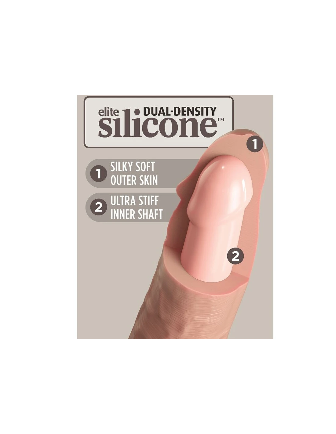 Este consolador de silicona King Cock Elite está hecho de silicona Elite de doble densidad de alta calidad, lo que lo hace rígido por dentro y suave por fuera.