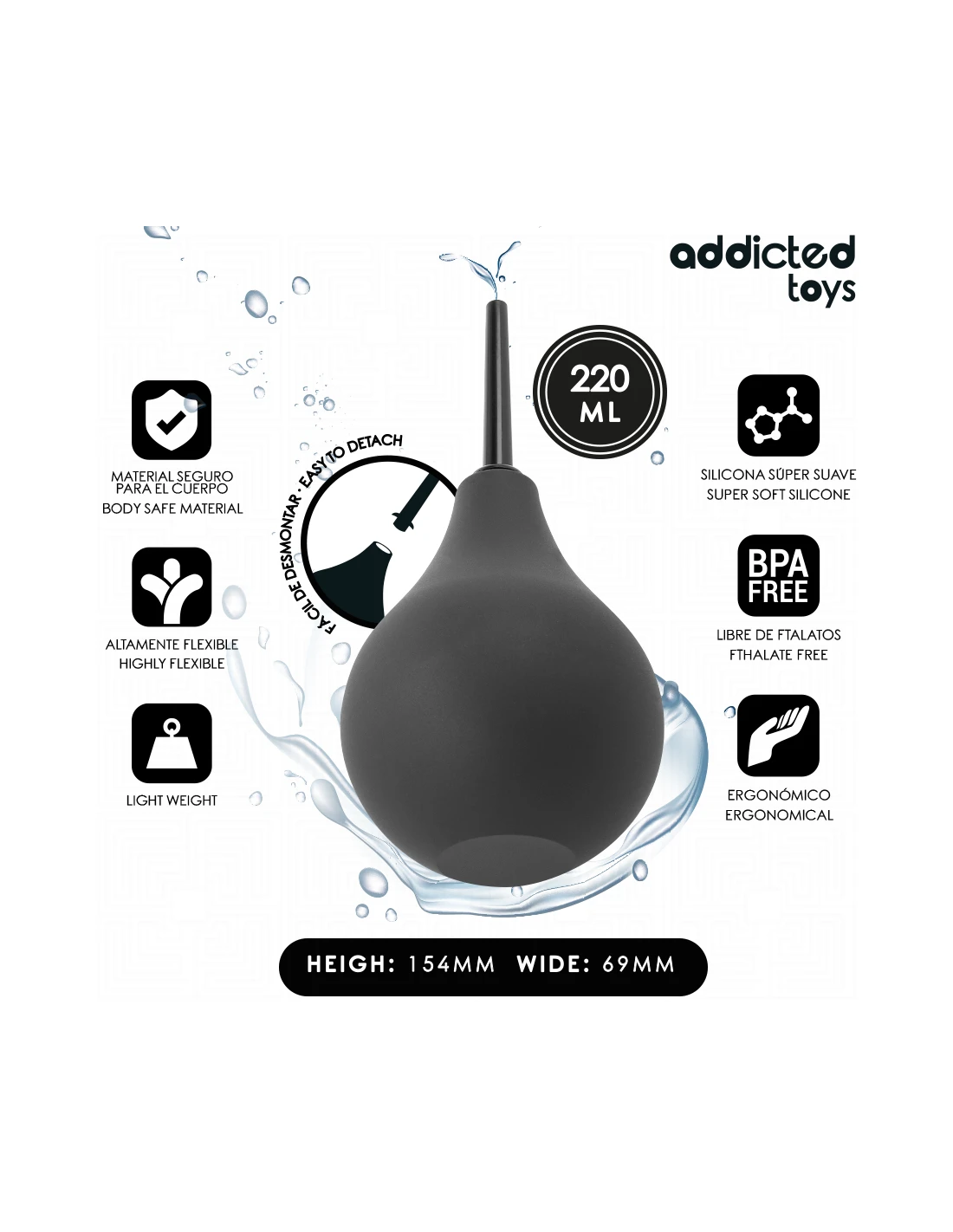 Fabricado con materiales de alta calidad, este limpiador es seguro para el cuerpo y fácil de usar. Su pera flexible permite una inserción controlada y efectiva, mientras que su tamaño compacto hace que sea fácil de transportar y almacenar.