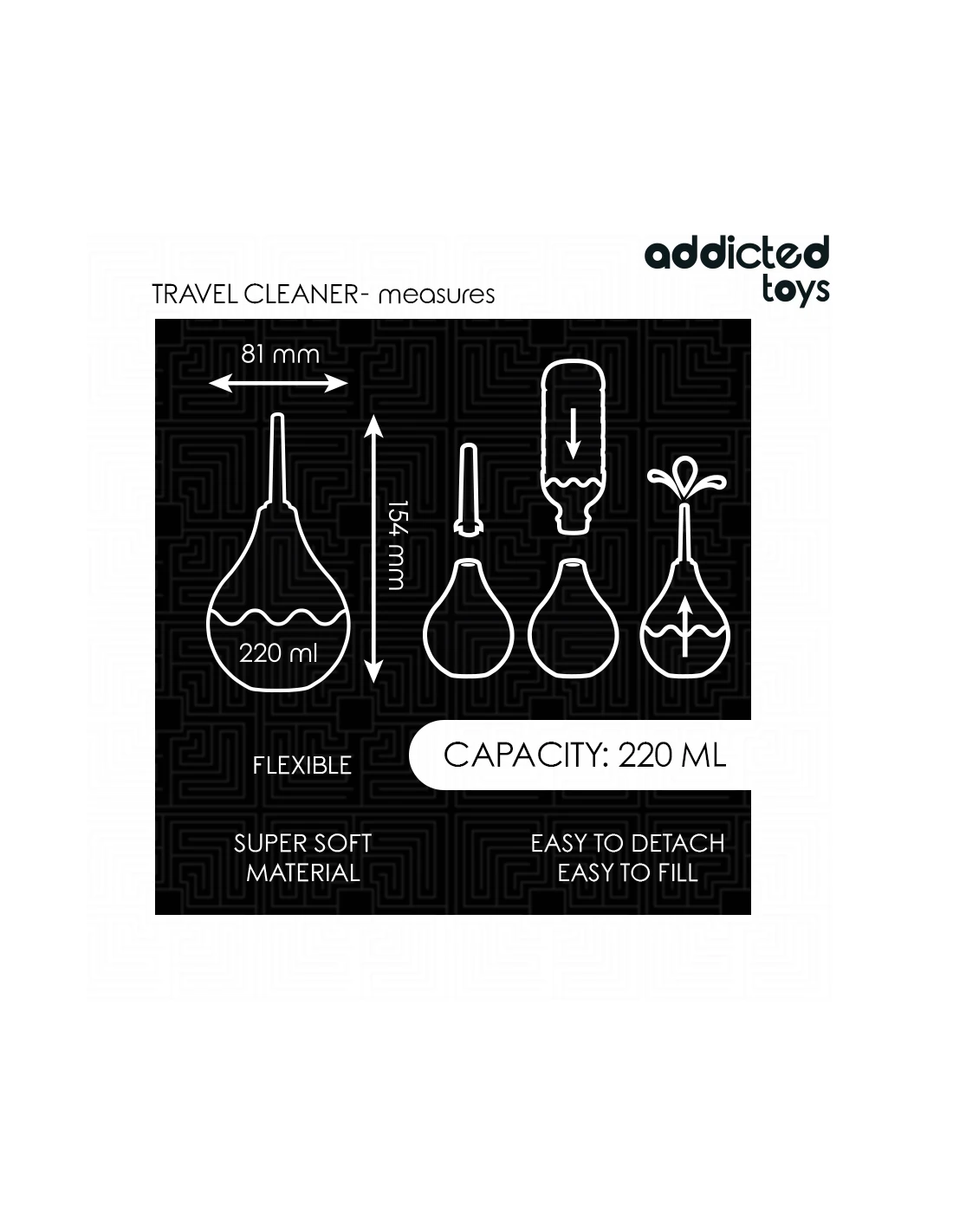 El limpiador anal de viaje talla L de Addicted Toys es una opción excelente para quienes buscan un producto de mayor capacidad y tamaño, ideal para una limpieza más profunda y eficaz antes o después de la estimulación anal. Con una capacidad de 220 ml, este limpiador asegura varias aplicaciones y es perfecto para quienes prefieren un producto de mayor duración sin sacrificar portabilidad. Su diseño práctico y ergonómico lo convierte en una opción conveniente y fácil de usar.