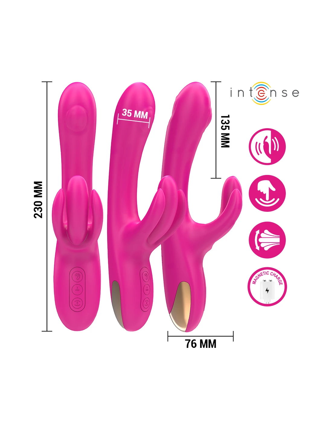 Con una longitud total de 23 cm y 13.5 cm insertables, su tamaño es perfecto para quienes buscan una penetración cómoda pero profunda, acompañada de una estimulación externa firme y constante gracias a su brazo rabbit flexible y preciso.