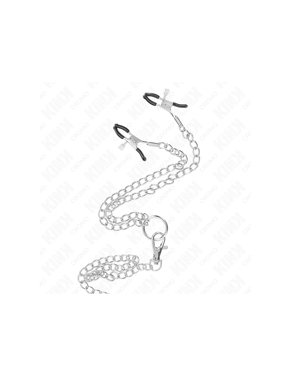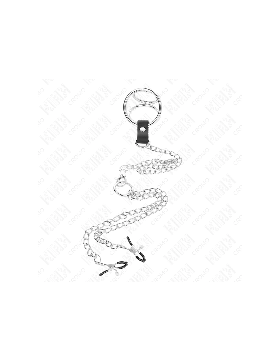 KINK - ANILLO PENE TRIPLE METAL CROMADO 3 CM A 4.5 CM CON CADENA METAL 26 CM Y PINZAS PARA PEZONES
